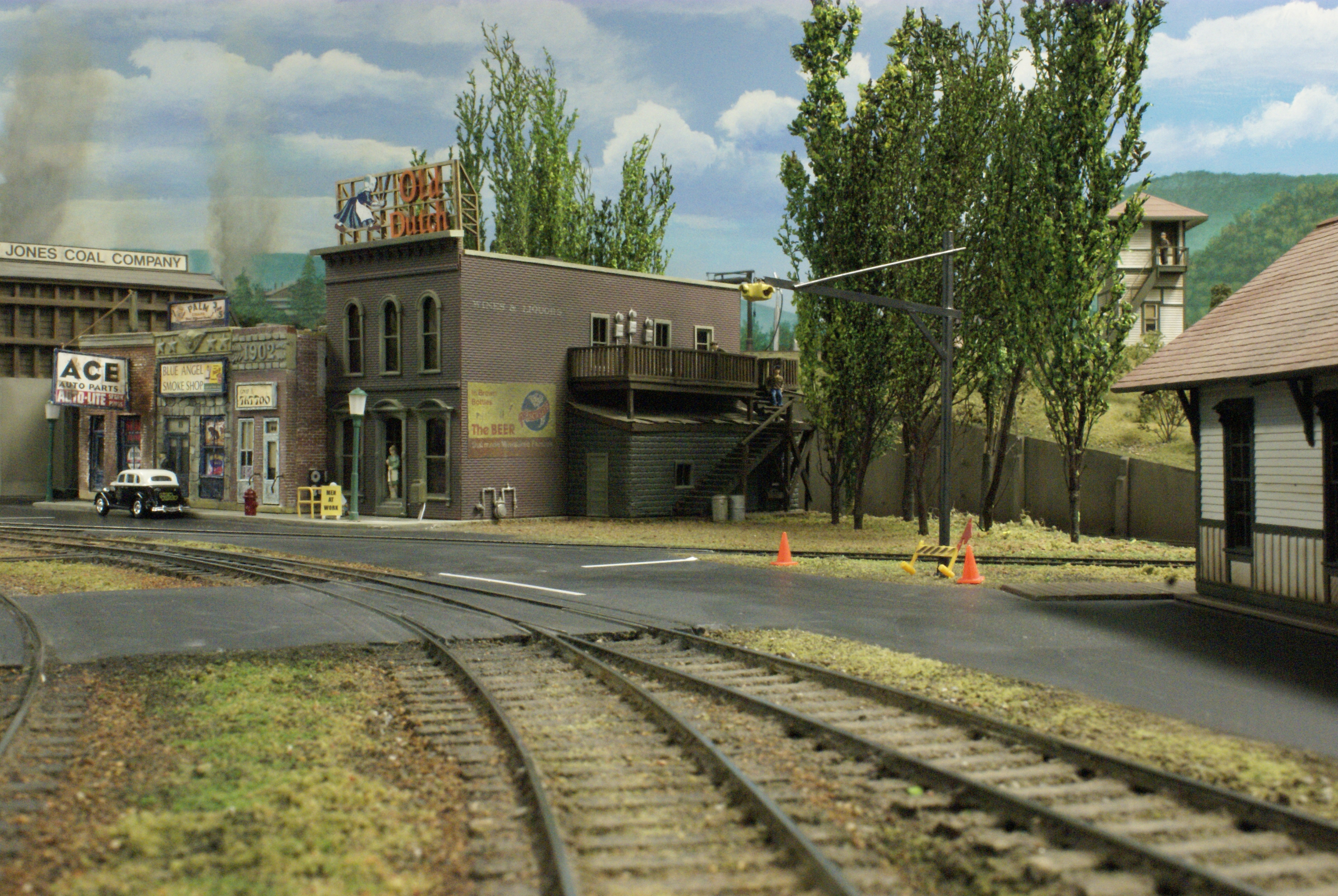 The seedy part of town is shown here with a tattoo parlor, smoke shop and a used (stolen?) auto parts store. The black&white police car just arrived in response to complaints of strange odors emanating from the front door of the smoke shop. The track directly behind the orange traffic cones is the town’s team track which has seen virtually every conceivable type of railroad car parked on it at one time or another over the years. The highlight of the year is when the circus train’s advertising car is parked on this siding so that colorful posters can be conveniently plastered on every square inch of available space all over town.