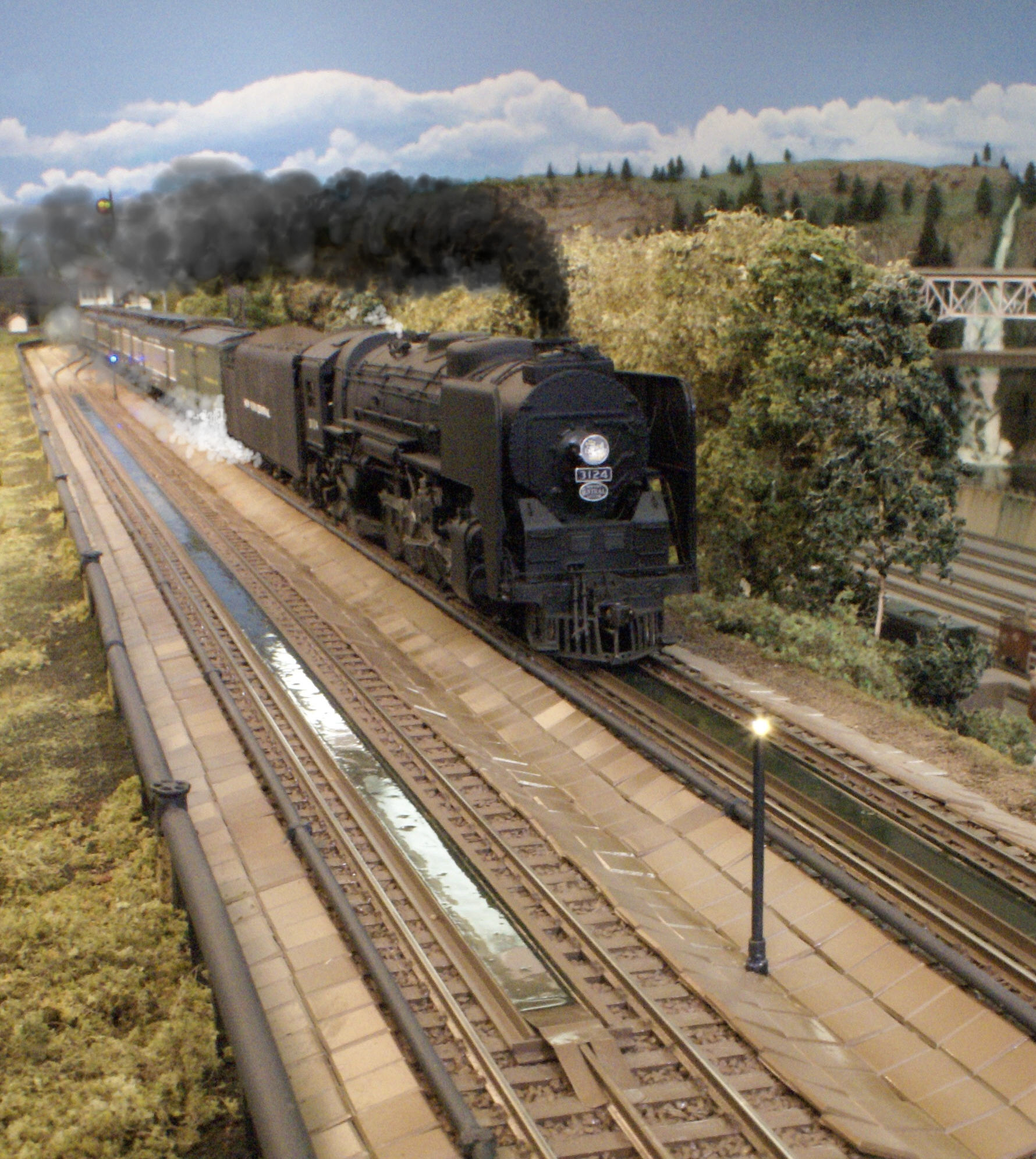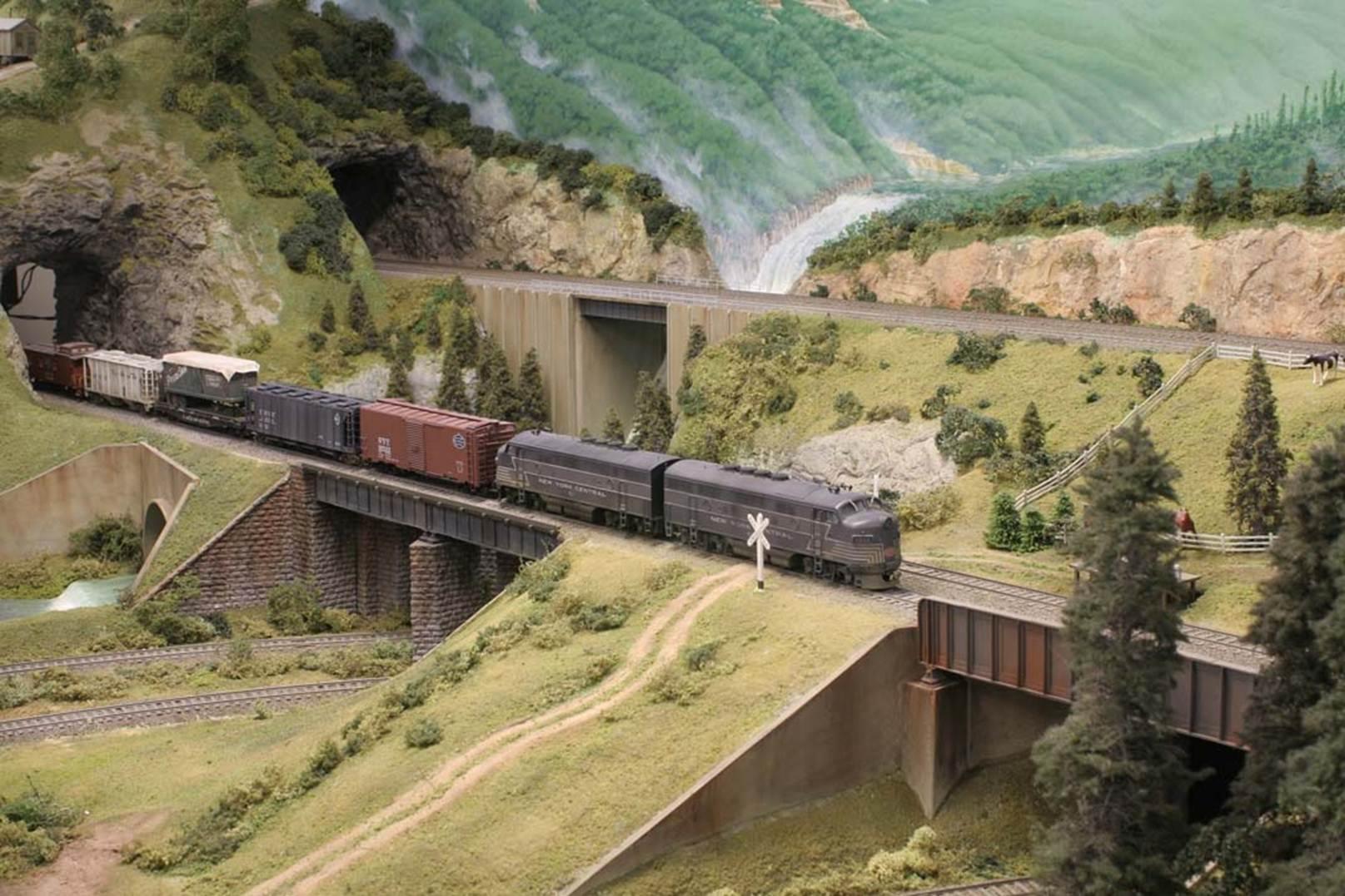 This deep scene is about ten feet from the foreground to the distant mountain. Deep scenes are a bit unusual since most model railroad layouts hug a wall and follow the arm’s length rule which states that everything should be within 24” for easy maintenance purposes. To enhance the illusion of great distance, note the large girder bridge in the foreground and the smaller bridges in the background.