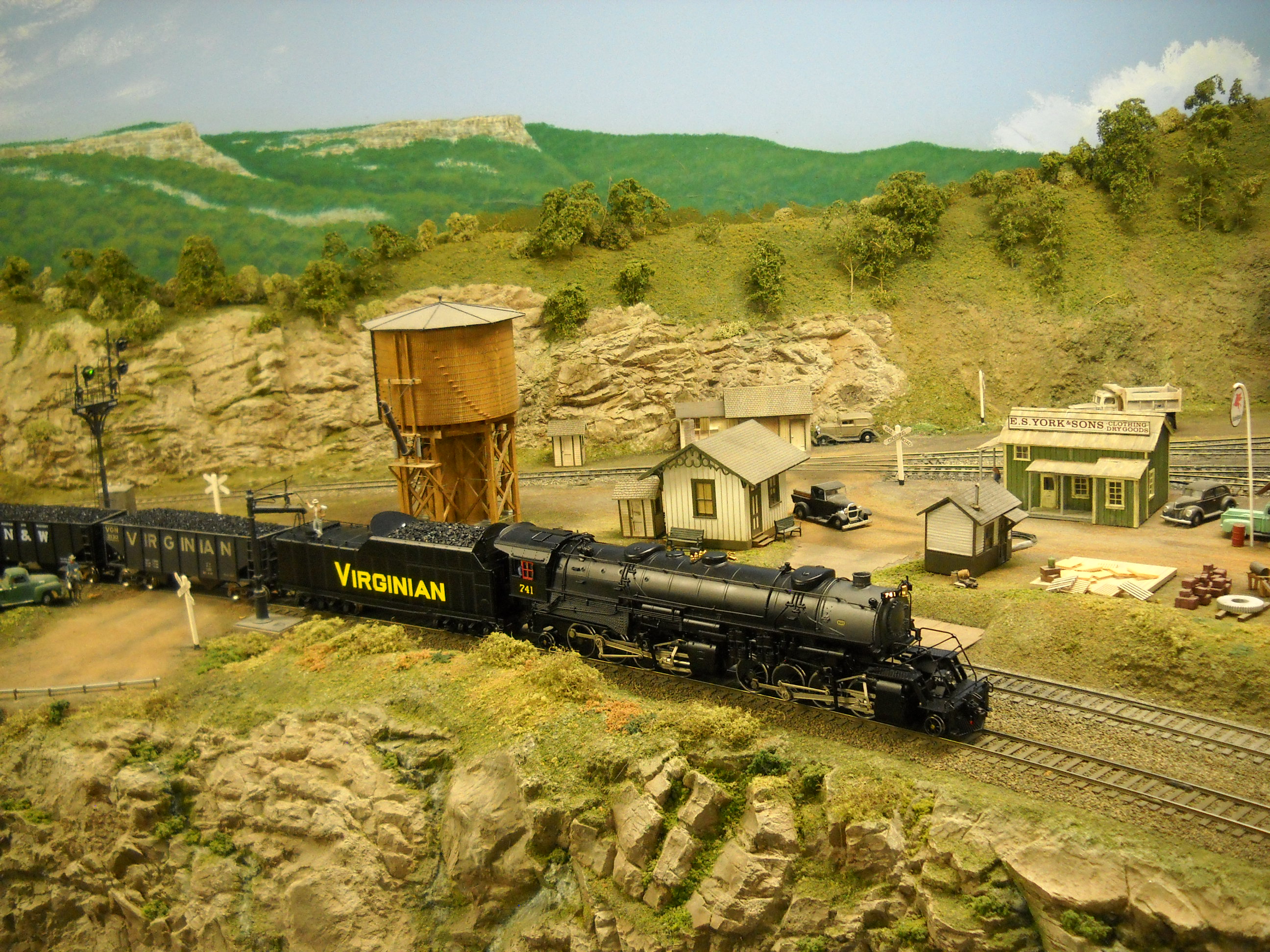 Mike Kotowski gets the credit for the beautiful artwork on the wall. Each of the walls has a masterpiece of his which blends in with the track geometry and structures to provide a wonderful overall impression. This scene also shows a small portion of the sawmill complex, the coal mine area, a dairy farm and the crude oil extraction site – all of which need a railroad for survival. The railing on the large cut stone viaduct is a modified HO highway bridge railing sold by Chooch Enterprises. This is an excellent example of how products intended for other scales can be effectively used on an S scale layout.