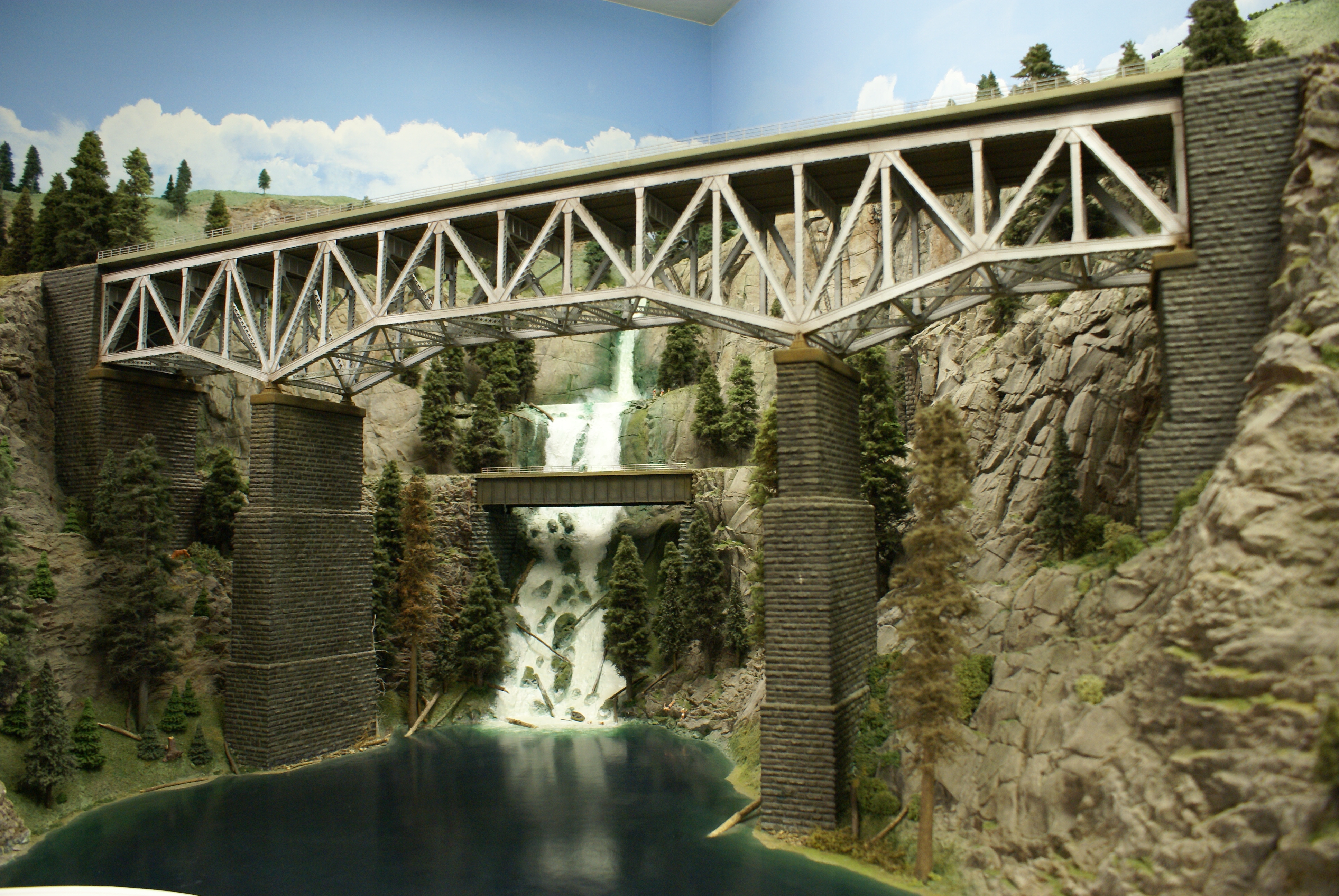 The large silver deck truss bridge was constructed by Don Ledger in cooperation with his friend who works for an engineering firm which designs real railroad bridges. As in the real world, piers are not to be placed in water, but can be located near the water’s edge. A deck truss design was chosen because the distance between the two piers was too great for a girder-based design. Through truss bridges are more expensive to construct than a deck truss (in the real world). The E 72 rating of this bridge was used when determining the dimensions and locations of all members. The high point of this project was when the famous John Armstrong came for a visit during an NMRA convention. He took one look at the bridge and announced, “That’s an E 72!” No one knew what he was talking about, but we all learned within the next five minutes. Don’s bridge has over 6,000 individual pieces of plastic and took about four years of evenings and weekends to complete.