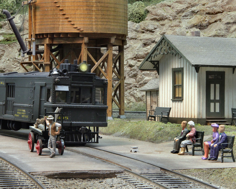 The afternoon train, affectionately known as a Doodlebug, arrives at a rural station to pick up passengers and packages destined for the big city. The well-dressed folks are planning to attend a wedding and want to look their finest for the occasion. Railroad workers, as usual, appear a bit grungy in comparison.