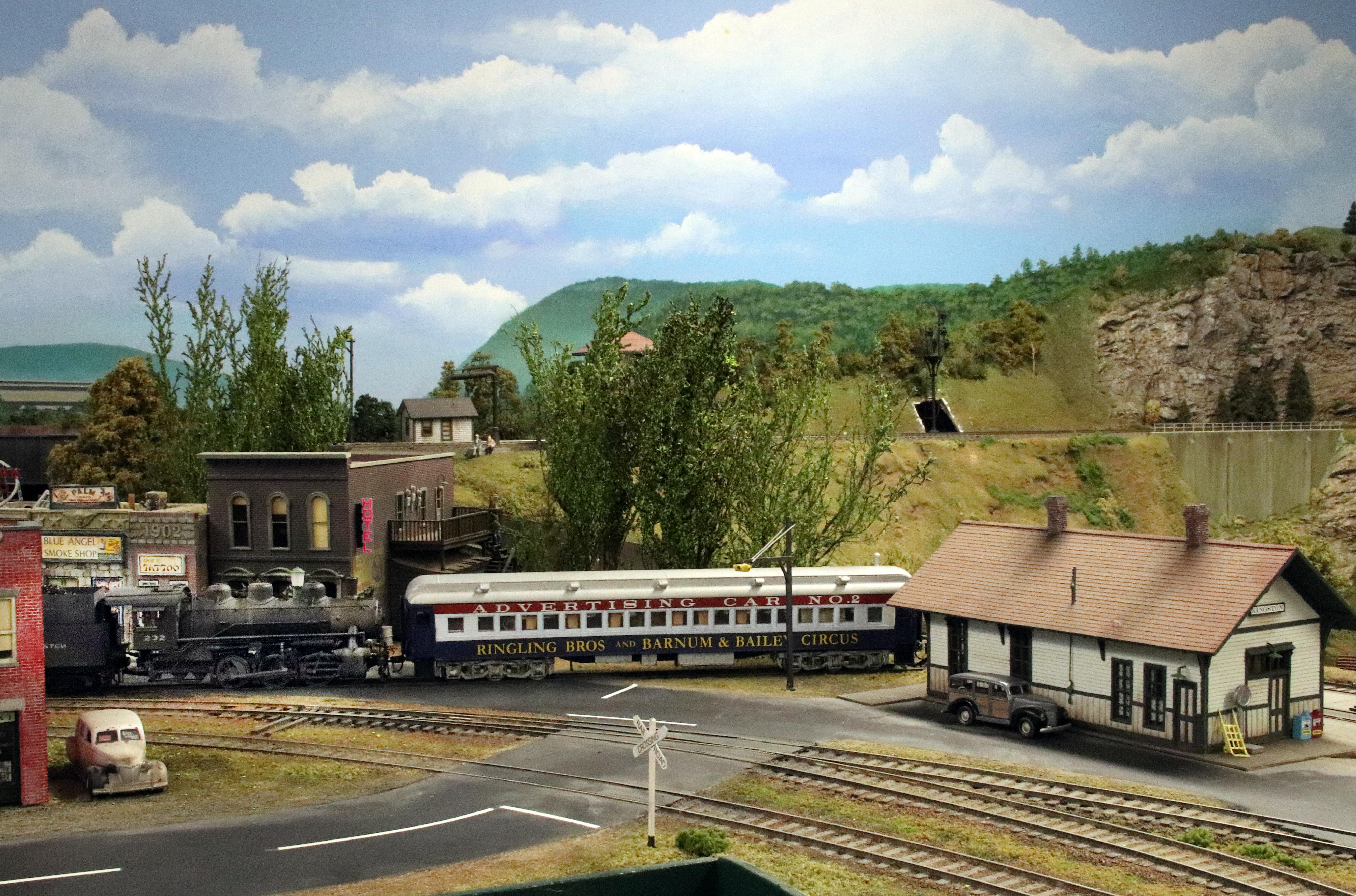 Two weeks before the circus came, an Advertising car would arrive in town to apply circus posters to every square foot of vacant space. Store owners were given free tickets for permitting signs in store windows. Elected officials received free tickets to encourage word-of-mouth promotion. NYC 0-6-0 #232 spots the Ringling Brothers Advertising Car on the town's team track.