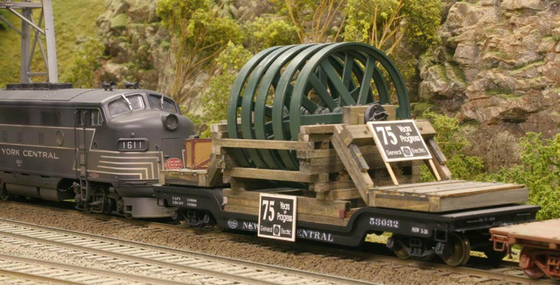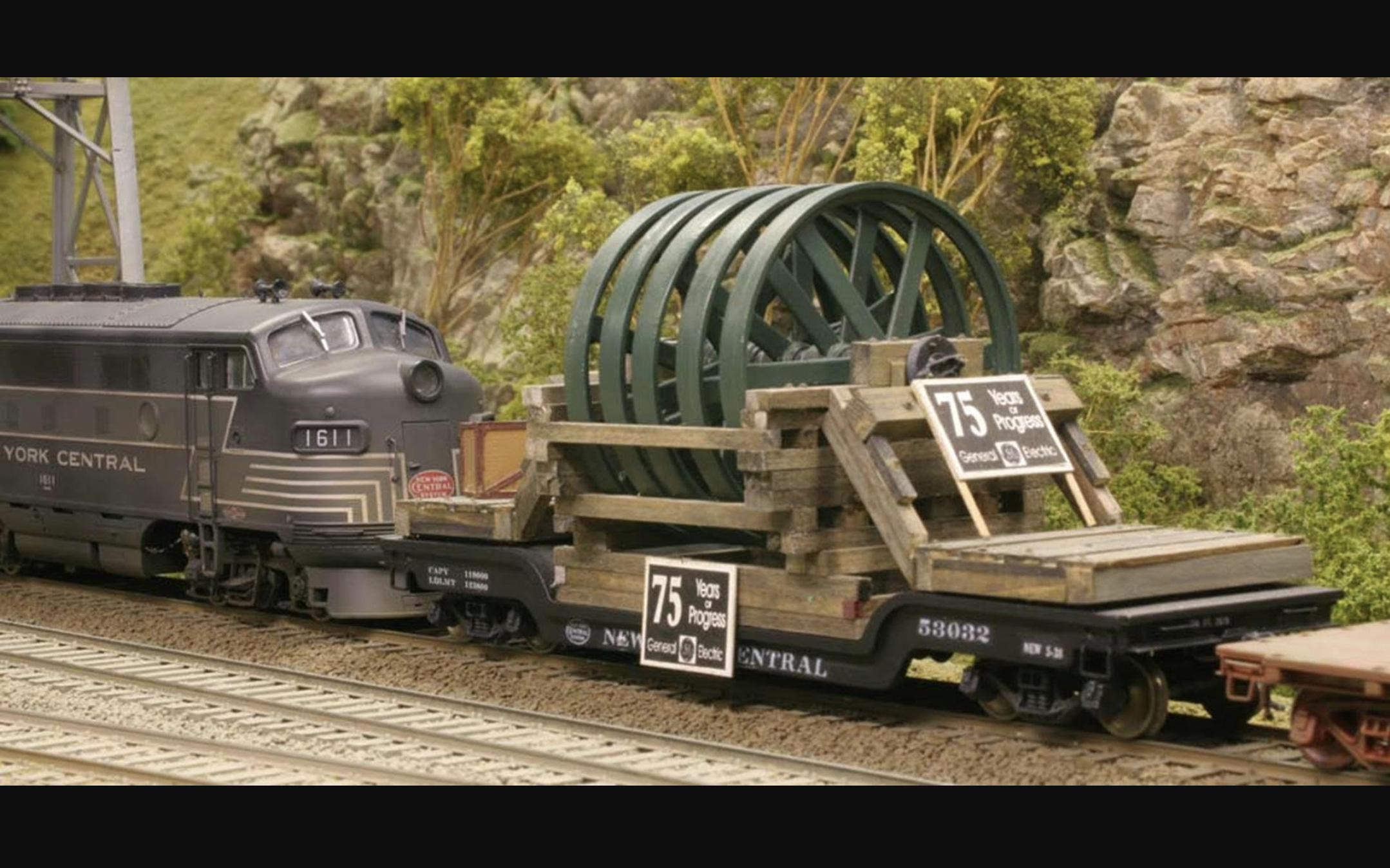Huge flywheels for industrial machinery require railroads for transportation since no other mode of land transportation is up to this task. The flat car with signage was modeled after a photograph in a GE employees magazine. Note the different colors of track ballast caused by sanding the rails on an uphill grade for increased traction.