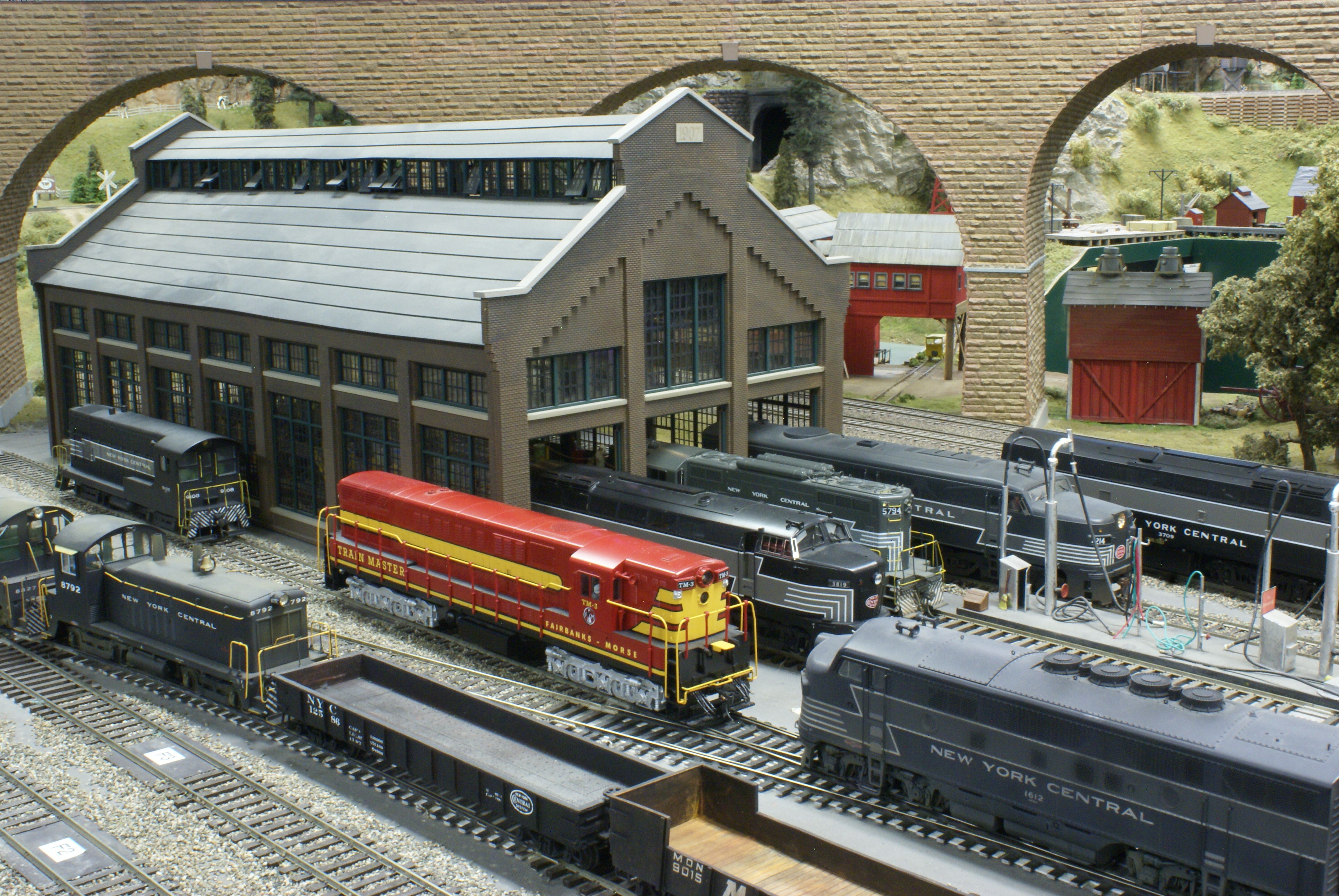 Here is a Fairbanks-Morse Trainmaster demonstrator engine spending some time near the NYC diesel shop. The large shop building was built by Jeff Springer based solely on photographs of the Collinwood Shops with considerable selective compression since the real thing is longer than a couple of football fields. The Trainmaster's usual assignment is pulling the colorful circus train.