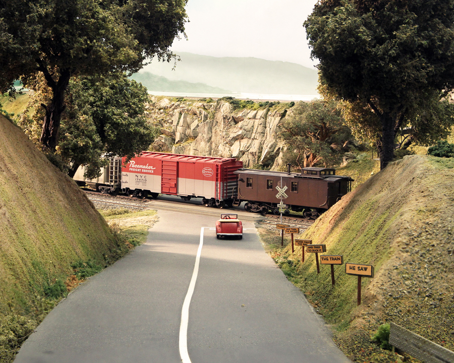 This scene illustrates a typical upstate New York area with the Hudson River in the background on a misty morning. The classic NYC Pacemaker box car, small-cupola caboose (limited tunnel clearances), Burma Shave signs and red convertible are certainly reminiscent of the 1950s. The vehicle’s driver is obviously attending to his biological needs just out of sight behind the hill since the train prevents driving forward. Yes, there is a logical explanation for everything.
